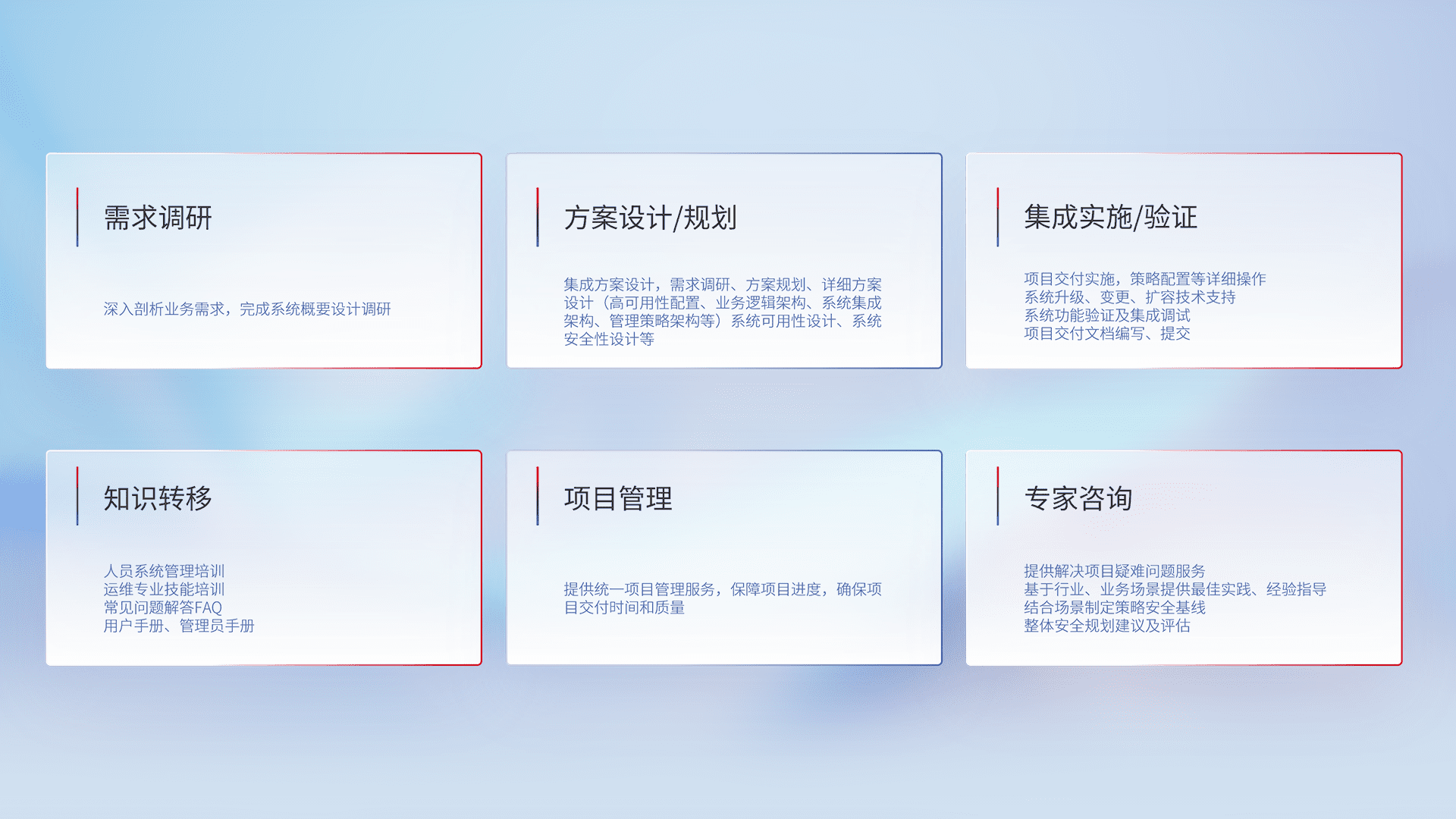针对客户行业特性,,将宏观的安全战略和需求,,通过专业的交付服务,,,,实现项目落地,,为客户提供标准规范的集成交付服务。。。